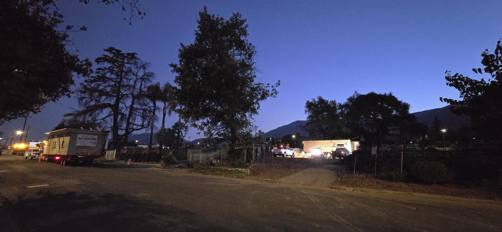 3016 will ultimately sit at the rear of the property, parallel to the street, with the front porch facing east to meet the sunrise every morning. Tomorrow night, her twin 3018 will make the same journey under the cover of night and be placed in front of 3016, perpendicular to Calaveras Street, on the southern portion of the lot.